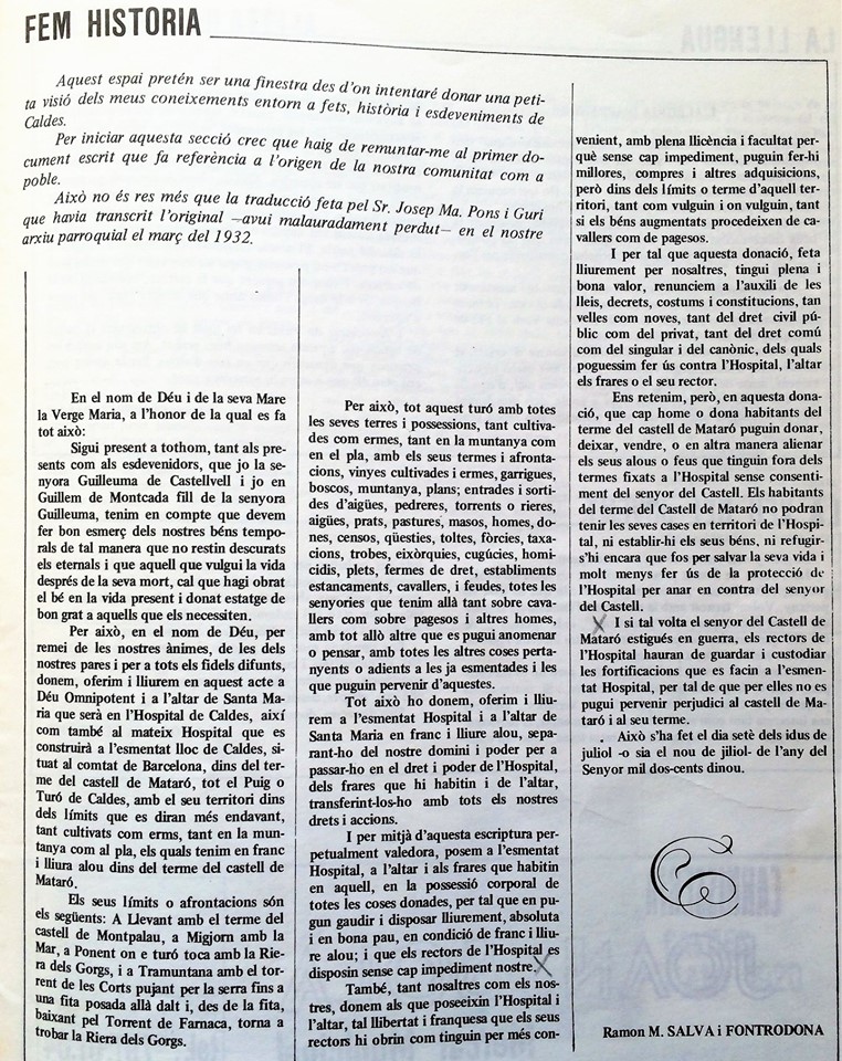 (Text d'Albert Batlle, historiador local i membre de la Comissió de preparació del 8è centenari de Caldes)