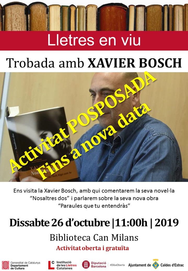 Atenció: informem que s'ha suspès l'activitat Lletres en viu: trobada amb Xavier Bosch prevista per al dissabte 26 d'octubre. Properament s'informarà de la nova data. Preguem disculpeu les molèsties.