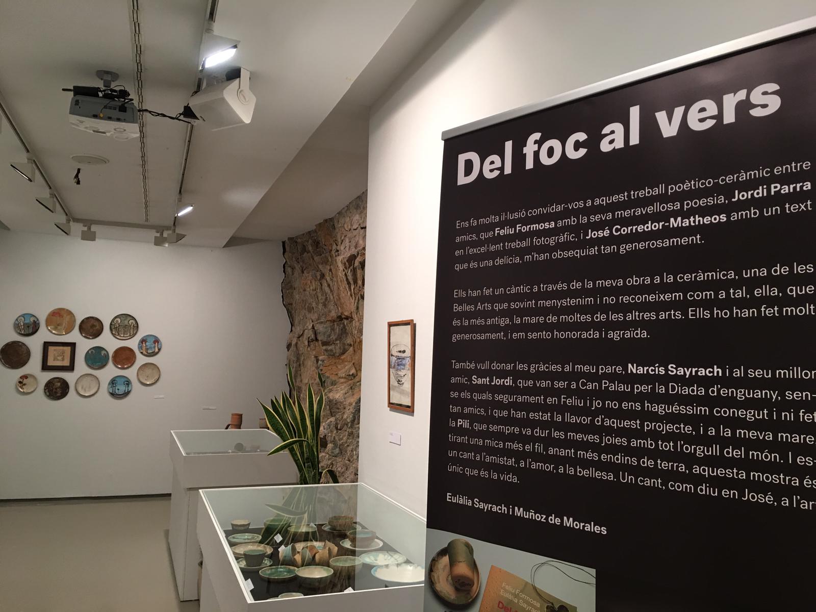 Més enllà del llibre, Del foc al vers és també una mostra on l’espectador pot gaudir del diàleg entre les ceràmiques d’Eulàlia Sayrach, que destaca pel seu innovador treball amb diferents terres i materials, amb els poemes de Feliu Formosa, conegut dramaturg i poeta que va néixer a Sabadell el 1934, i autor de poemaris tan celebrats com El llibre dels viatges, amb el que va obtenir el premi Carles Riba de poesia i la poesia.