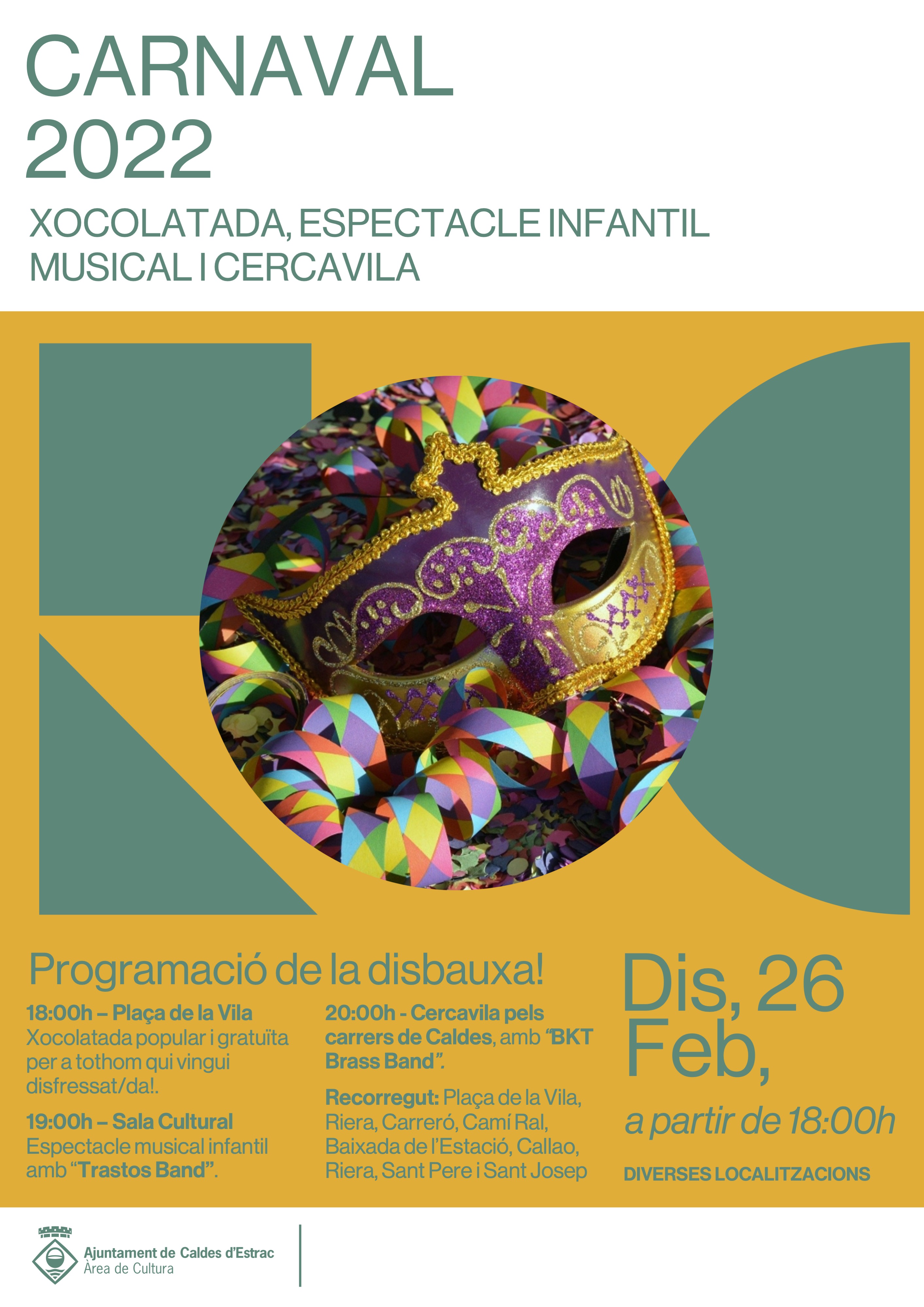 El pròxim dissabte 26 de febrer, Caldes d'Estrac s'omplirà de disbauxa i festa. Les activitats començaran a les 18 hores a la Plaça de la Vila amb una xocolatada popular. En aquest sentit, les persones que vinguin disfressades en podran gaudir de manera gratuïta. Tot seguit, a les 19 hores, la Sala Cultural de l’Ajuntament de Caldes d’Estrac acollirà un espectacle musical infantil de la mà de Trastos Band. A continuació, a les 20 hores, una cercavila recorrerà alguns dels carrers del municipi a ritme de BKT Brass Band. En concret, l’itinerari començarà a la Plaça de la Vila i continuarà per la Riera, el Carreró, el Camí Ral, la Baixada de l’Estació, el carrer Callao, la Riera, el carrer Sant Pere i el carrer Sant Josep. Durant el recorregut, la cercavila farà parada als següents establiments caldencs: Tête à Tête, Pizzeria Estrac, Can Suñé, La Tasqueta de Caldes, Ca l’Adela, La Granja i Metru. «Com les dades epidemiològiques han millorat, podem oferir una petita programació especial amb motiu del Carnaval. Tot i que ens agradaria, encara no podem organitzar una celebració popular com la d’anys anteriors. Esperem que la situació sanitària continuï millorant durant els pròxims mesos i aviat poder recuperar completament la cultura popular», afirma el regidor de Cultura, David Salvà.