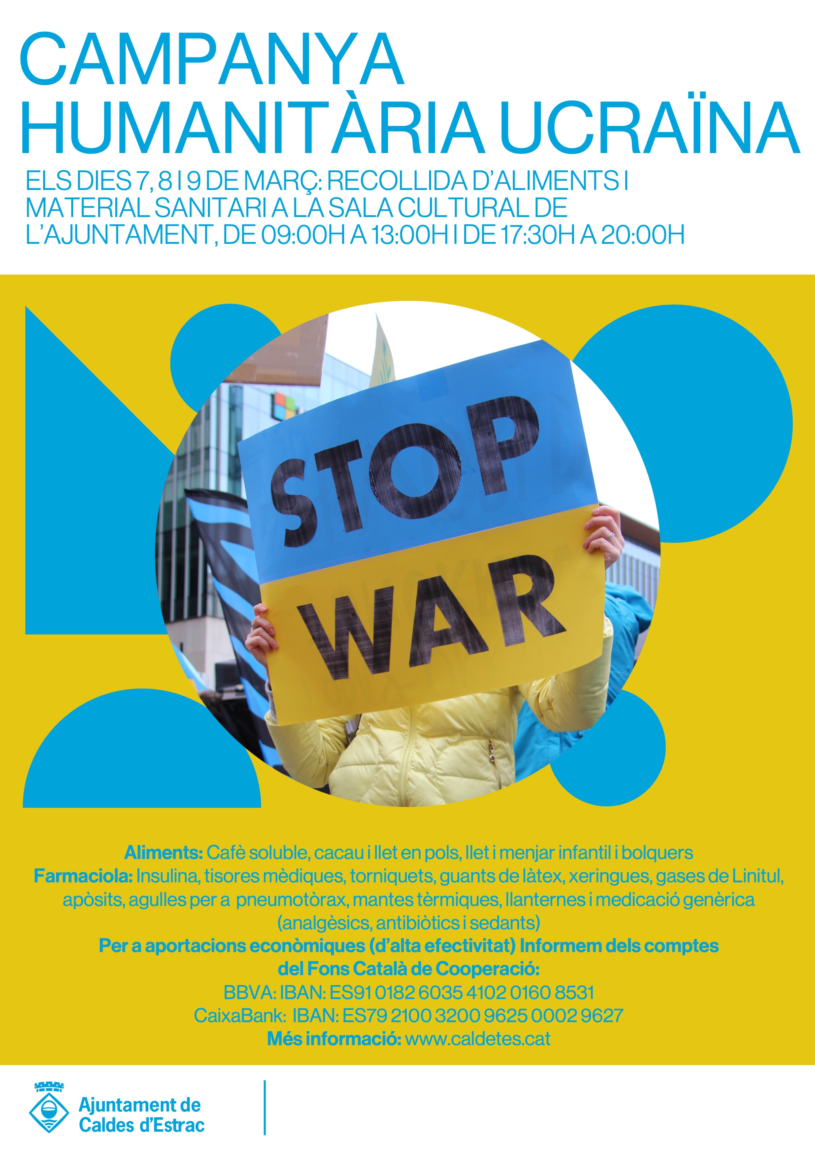 L’Ajuntament de Caldes d’Estrac posa en marxa una campanya humanitària en suport al poble ucraïnès. El pròxim dilluns 7, dimarts 8 i dimecres 9 de març, el consistori caldenc recollirà aliments i material sanitari a la Sala Cultural de l’Ajuntament, situada a la primera planta de l’edifici. L’horari de la recollida d’aliments i material sanitari serà de 9 a 13 hores i de 17.30 a 20 hores.