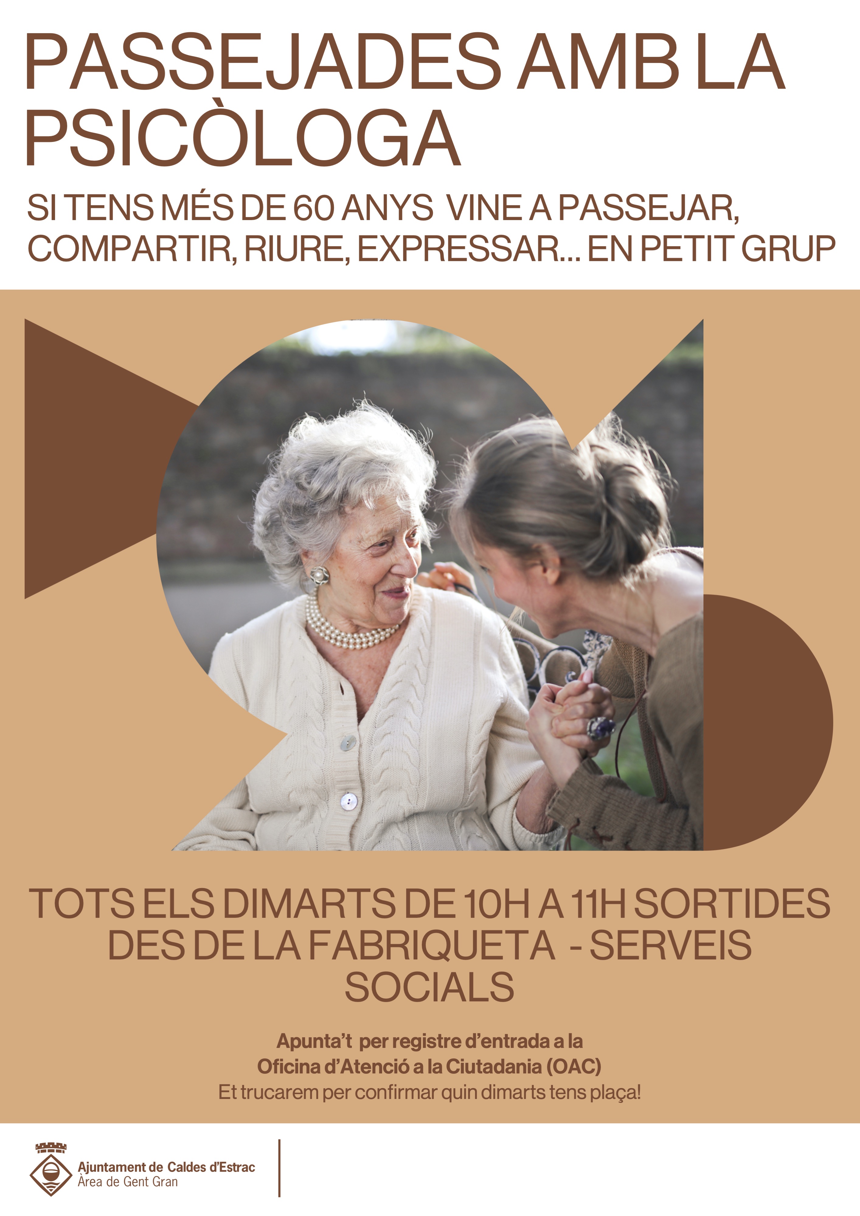 El pròxim dimarts 15 de març, l’Àrea de Gent Gran de l’Ajuntament de Caldes d’Estrac tornarà a posar en marxa les passejades per a la gent gran. De la mà de la tècnica municipal, tots els dimarts, de 10 a 11 hores, s’organitzaran suaus recorreguts pel poble. L’activitat, que començarà a La Fabriqueta (carrer La Riera, 5-9), està pensada per a persones majors de 60 anys.