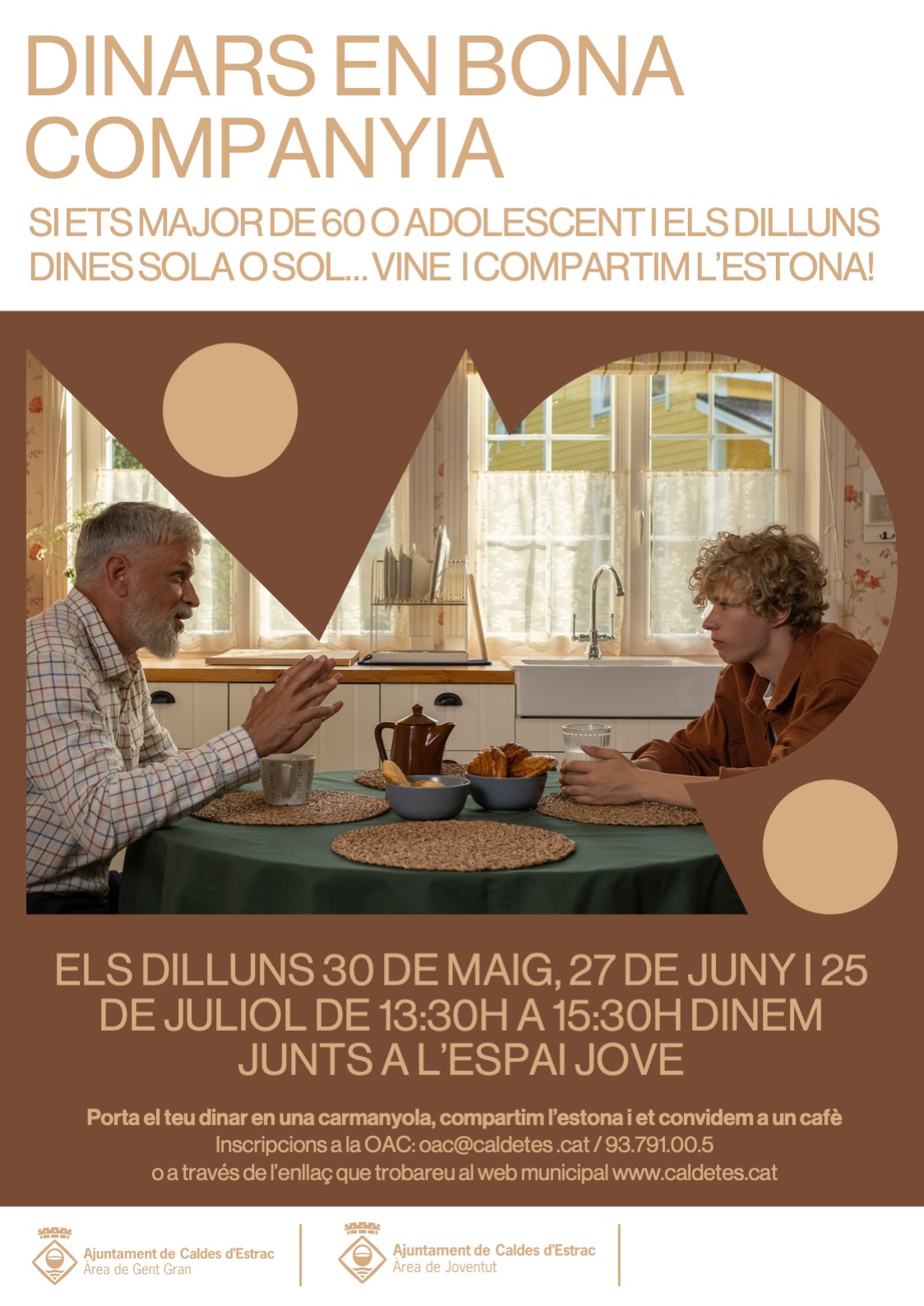 Les àrees de Gent Gran i Joventut de l’Ajuntament de Caldes d’Estrac presenten dues noves activitats intergeneracionals. La primera proposta està pensada per a persones majors de 60 anys i adolescents que acostumen a dinar sense companyia. En aquest sentit, els pròxims dilluns 30 de maig, 27 de juny i 25 de juliol, des de les àrees de Joventut i Gent Gran de l’Ajuntament, es convida a venir a l’Espai Jove de 13.30 a 15.30 hores i dinar conjuntament. L’activitat comptarà amb l’acompanyament dels tècnics municipals. Les persones que hi assisteixin hauran de portar la seva carmanyola i posteriorment s’oferirà gratuïtament un cafè. Per a participar-hi, cal apuntar-se a través d’un formulari en línia, escrivint al correu oac@caldetes.cat o trucant al 93 791 00 05.