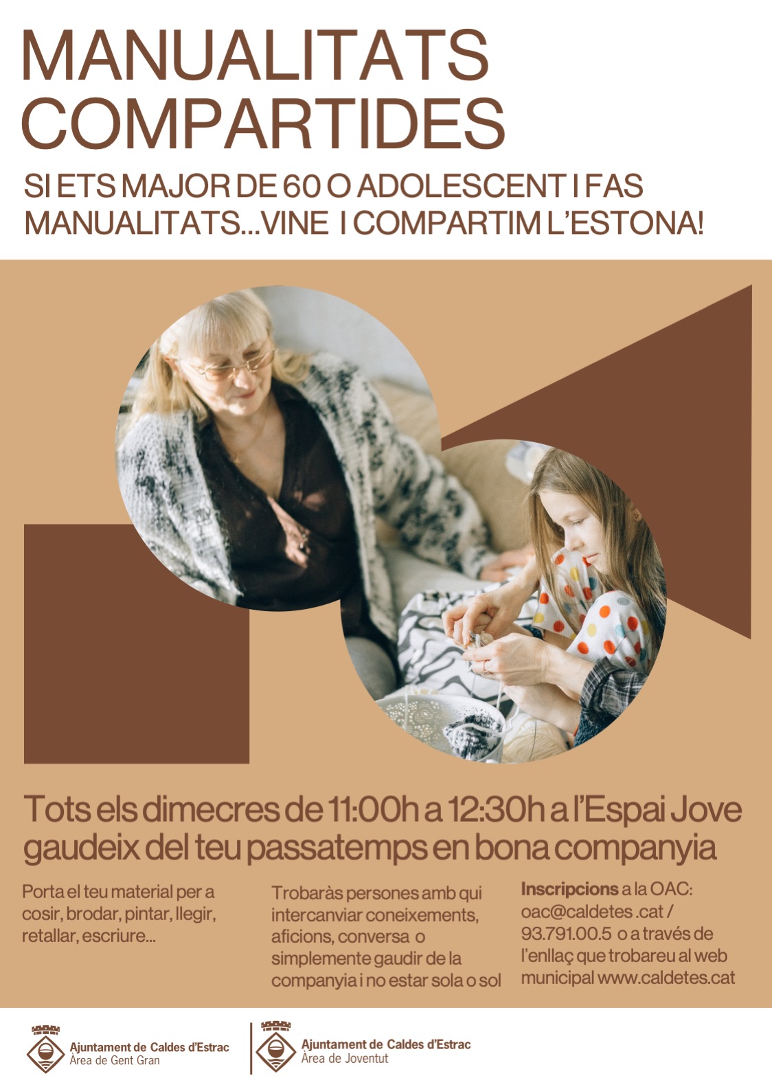 La segona proposta posa el focus en els treballs manuals i anima a adolescents i persones grans a compartir les seves aficions. A partir del pròxim dimecres 25 de maig, tot i que s’espera que el jovent s’uneixi a l’activitat un cop acabi el curs escolar, tots els dimecres, d’11 a 12.30 hores, l’Espai Jove de Caldes d’Estrac esdevindrà un punt de trobada per a intercanviar coneixements, converses i passatemps. Les persones que hi assisteixin hauran de portar els seus materials per a cosir, brodar, pintar, llegir, retallar, escriure i un llarg etcètera de possibilitats. L’activitat també comptarà amb l’acompanyament dels tècnics municipals. Per a participar-hi, cal apuntar-se a través d’un formulari en línia, escrivint al correu oac@caldetes.cat o trucant al 93 791 00 05.