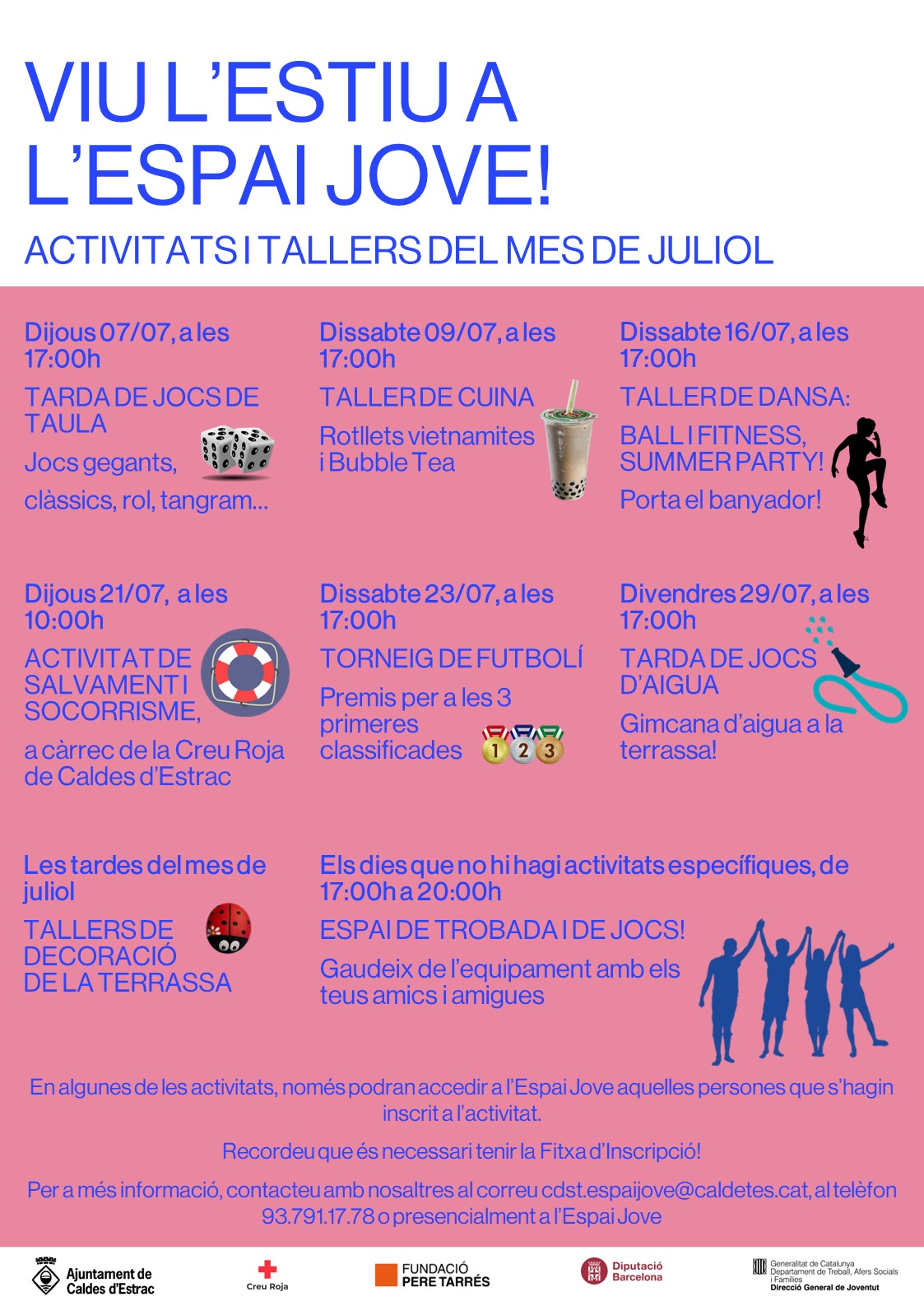 L’Àrea de Joventut de l’Ajuntament de Caldes d’Estrac ha presentat la programació del mes de juliol. La primera proposta serà el pròxim dijous 7 de juliol, a les 17 hores. L’equipament municipal acollirà una divertida tarda de jocs de taula. Jocs gegants, clàssics, de rol, tangram i moltes opcions més faran passar una bona estona al jovent del municipi. Tot seguit, el dissabte 9 de juliol, a les 17 hores, s’organitzarà un taller de cuina per a aprendre a preparar rotllets vietnamites i bubble tea.